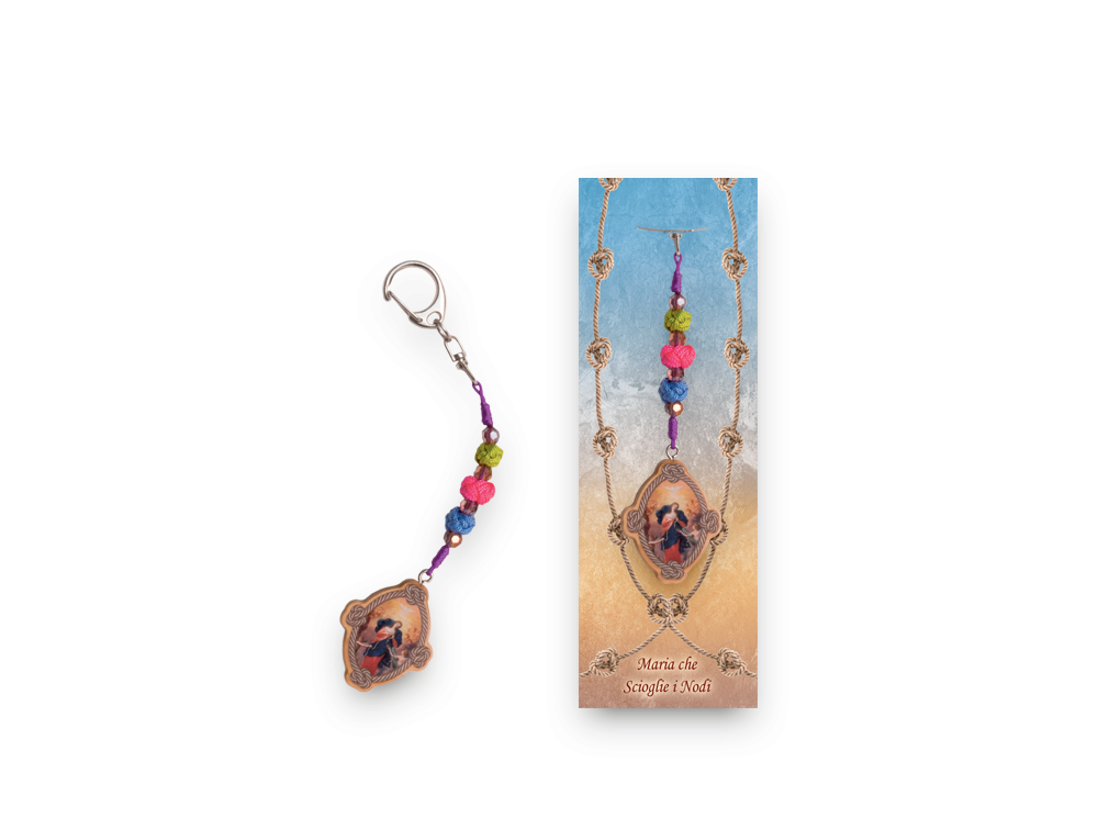 Portachiavi in legno d'ulivo con Maria che Scioglie i Nodi